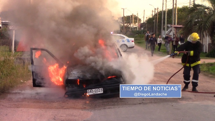 Un automóvil Renault 19 matrícula DAB 0523, de color verde, tomó fuego mientras circulaba por el acceso a Barra de Chuy a la altura de la Parada 14. Sus dos ocupantes, un hombre 66 años y una mujer 62, lograron salir ilesos.