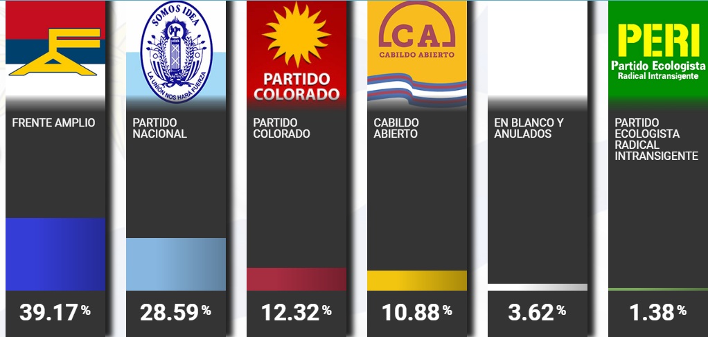 Frente Amplio obtuvo el 39.17%, Partido Nacional 28.59%, Partido Colorado alcanzó 12.32% y Cabildo Abierto 10.88%