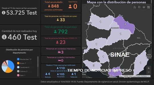 En la jornada fueron analizados 460 análisis de COVID-19, sin detectar la enfermedad en las pruebas, informó el Sistema Nacional de Emergencia (Sinae). Hasta el momento, fueron registrados 848 casos de coronavirus, con 792 personas recuperadas y 23 fallecidos. De las 33 personas con el virus, tres se encuentran en cuidados intensivos.