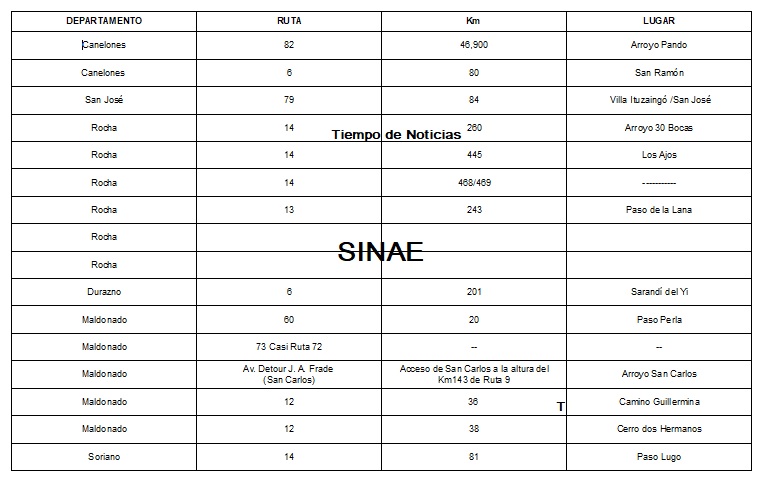 La Dirección Nacional de Policía de Tránsito en su reporte de las 16 hs informa que permanecen cortadas en distintos tramos las rutas 6, 8, 12, 13, 14 , 73, 79 y 82 afectando los departamentos de Canelones, Durazno, Maldonado, Rocha, San José y Soriano de acuerdo al detalle que sigue: