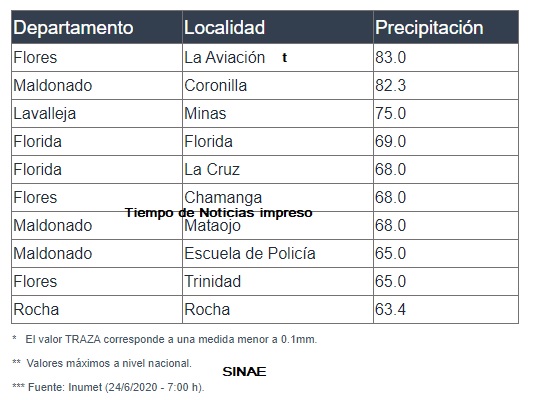 De acuerdo a los datos de las estaciones meteorológicas los máximos volúmenes de precipitaciones tuvieron lugar en los departamentos de Flores, Maldonado y Lavalleja según el detalle que sigue: