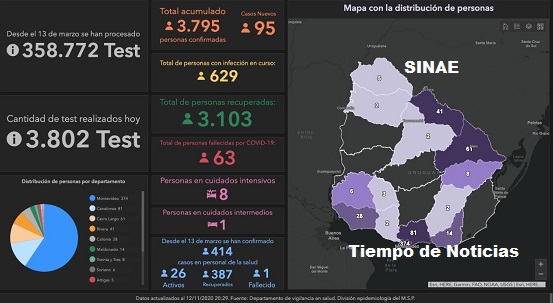 Tiempo de Noticias – Informe del Sinae – Con el análisis de 3.802 pruebas de COVID-19, este jueves 12 fueron detectados 95 casos nuevos de la enfermedad, 60 de Montevideo, 8 de Canelones, 8 de Cerro Largo, 6 de Maldonado, 6 de Rivera, 5 de Colonia y 2 de Soriano, informó el Sistema Nacional de Emergencias (Sinae). Actualmente hay 629 casos, 8 de personas están en cuidados intensivos y 1 en cuidados intermedios.