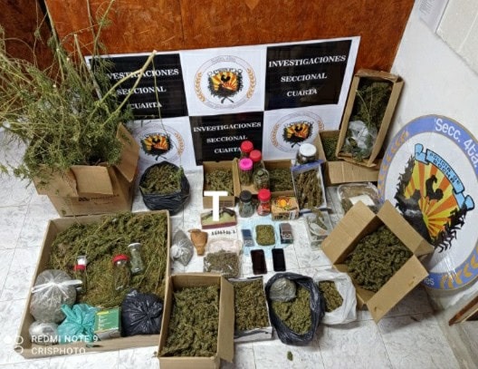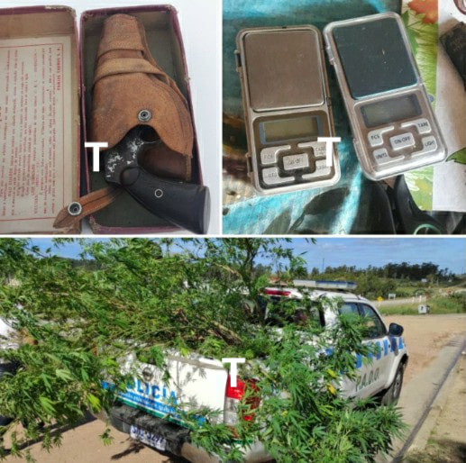 3) En otra finca, se incautó 14 gajos de 3 plantas de cannabis, 3 plantas (dos en tierra y una en maceta), 12 bollones con sustancia vegetal, una 1 lata con igual sustancia y 9 bolsas ziploc con dicha sustancia. Pesada la marihuana que estaba envasada resultó en 775 gramos. Fueron detenidos una mujer de 22 años y un hombre de 25 años, resultando este último, formalizado por la presunta comisión de “un delito previsto en el Art. 34 Ley 14.294 en la modalidad de suministro de sustancias estupefacientes”.