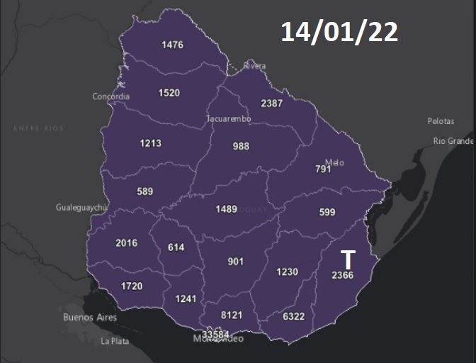 El Sistema Nacional de Emergencias (Sinae) informó, este 14 de enero, que, de los 6.832 nuevos casos, 3.325 son de Montevideo, 843 de Canelones, 529 de Maldonado, 279 de Colonia, 246 de Rocha, 158 de Rivera, 151 de Durazno, 150 de Lavalleja, 149 de Paysandú, 145 de Tacuarembó, 144 de Salto, 142 de Soriano, 101 de Florida, 98 de San José, 96 de Artigas, 78 de Cerro Largo, 78 de Treinta y Tres, 65 de Río Negro y 55 de Flores.