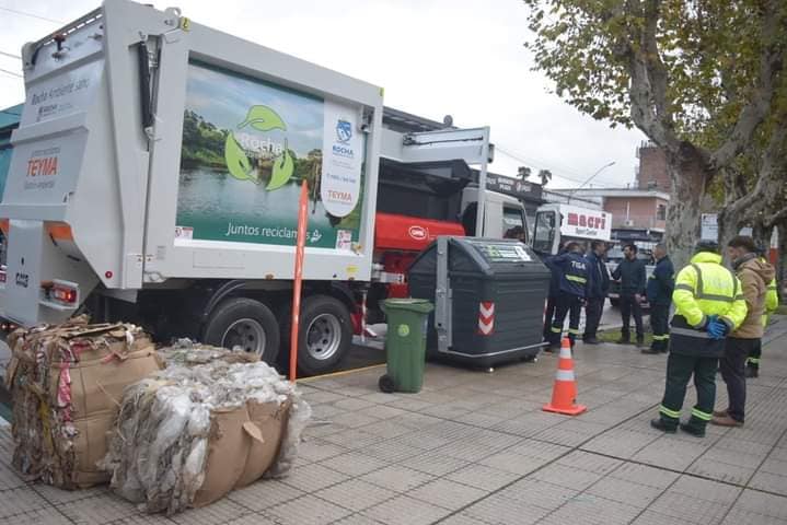 El Intendente de Rocha, Alejo Umpiérrez, junto al director de Higiene Ambiental, Ramon Lorente, y los directivos de la empresa TEYMA, presentaron el nuevo equipamiento y modalidad de recolección de residuos para el departamento.