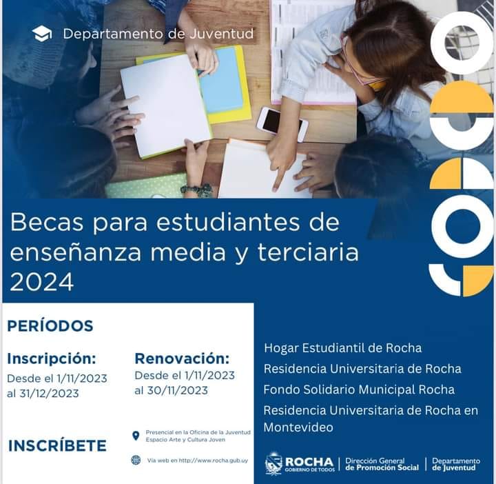 La Dirección de Juventud del Gobierno de Rocha informa que se abrirá un nuevo período de inscripción de becas para estudiantes de enseñanza media y terciaria.