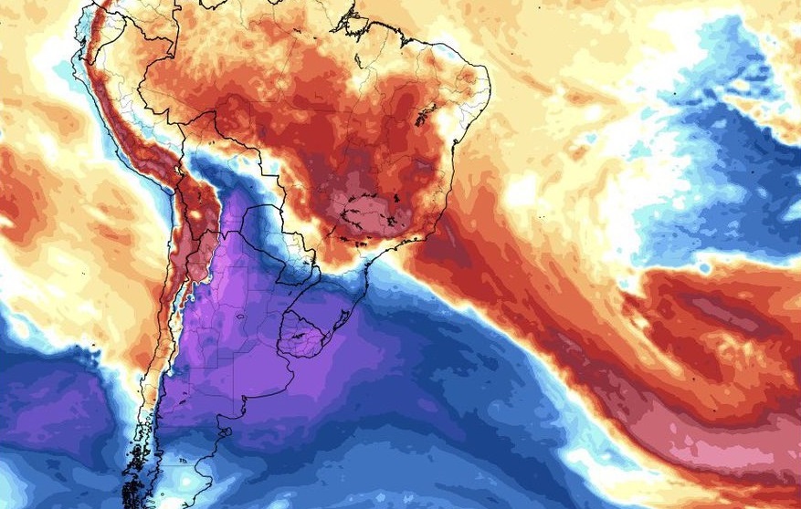 El profesional adjuntó un mapa en el que se ve cómo Uruguay queda incluido en una “zona gélida” que incluye la mayor parte del territorio argentino y también el sur de Brasil.
