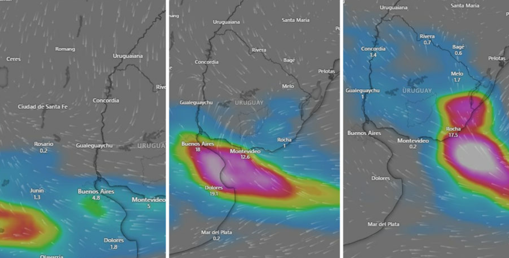 De acuerdo con el modelo GFS, creado y utilizado por la Administración Nacional Oceánica y Atmosférica estadounidense, la lluvia dará un “rodeo” por el Río de la Plata, “esquivará la zona oeste, Montevideo y Canelones”, e ingresará con gran intensidad desde el sureste del país.